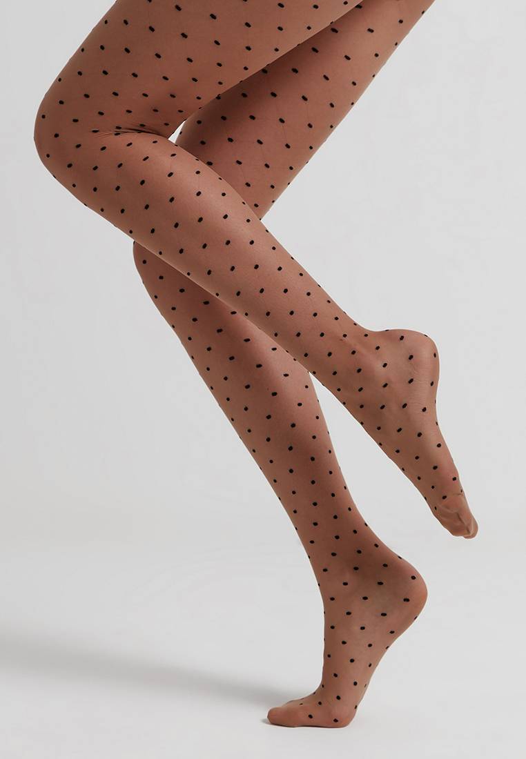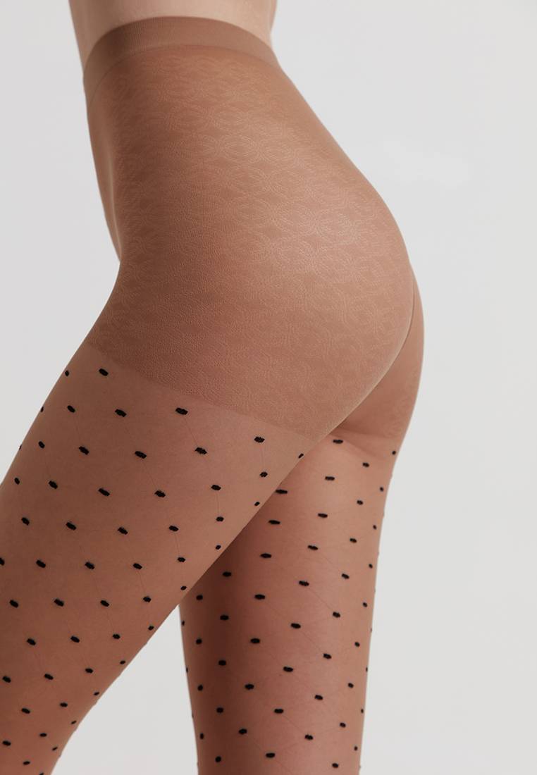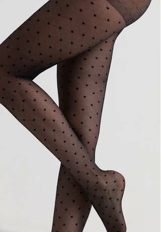 Тонкие фантазийные колготки с фактурным геометрическим рисунком «точки» – must have в стильном гардеробе. Колготки помогут привлечь внимание к ногам и визуально сделают их стройнее. · удобный пояс · усиленный торс в виде шортиков · плоский шов · хлопковая ластовица.